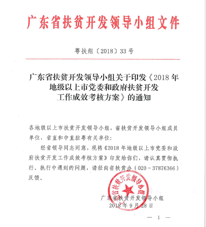 广东省扶贫开发领导小组关于印发《2018年地级以上市党委和政府扶贫开发工作成效考核方案》的通知(粤扶组【2018】33号)