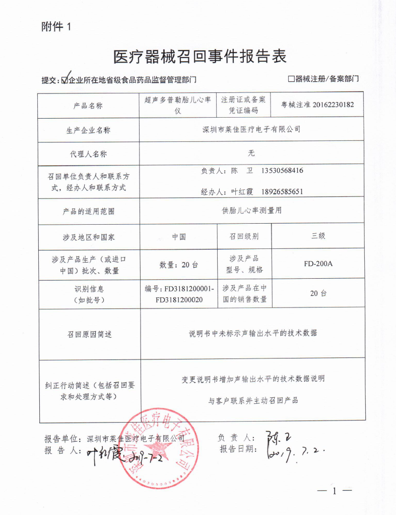 (转载)深圳市莱佳医疗电子有限公司对超声多普勒胎儿心率仪进行主动召回