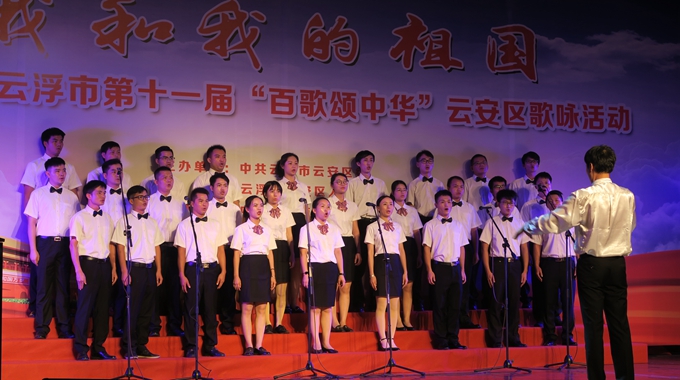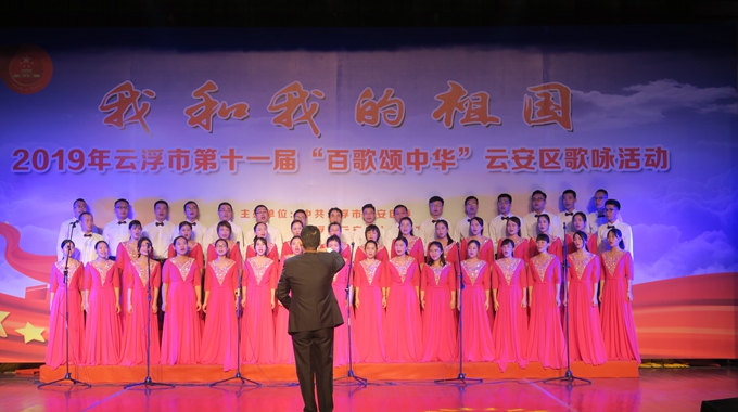 7月17日下午,由中共云浮市云安区委、区人民政府主办的“我和我的祖国—2019云浮市第十一届‘百歌颂中华’歌咏活动”在云安区会议中心大会堂举行。来自云安区直系统党委及各个乡镇等14支代表队参加演出,他们用洪亮歌声歌颂党恩、歌颂祖国。