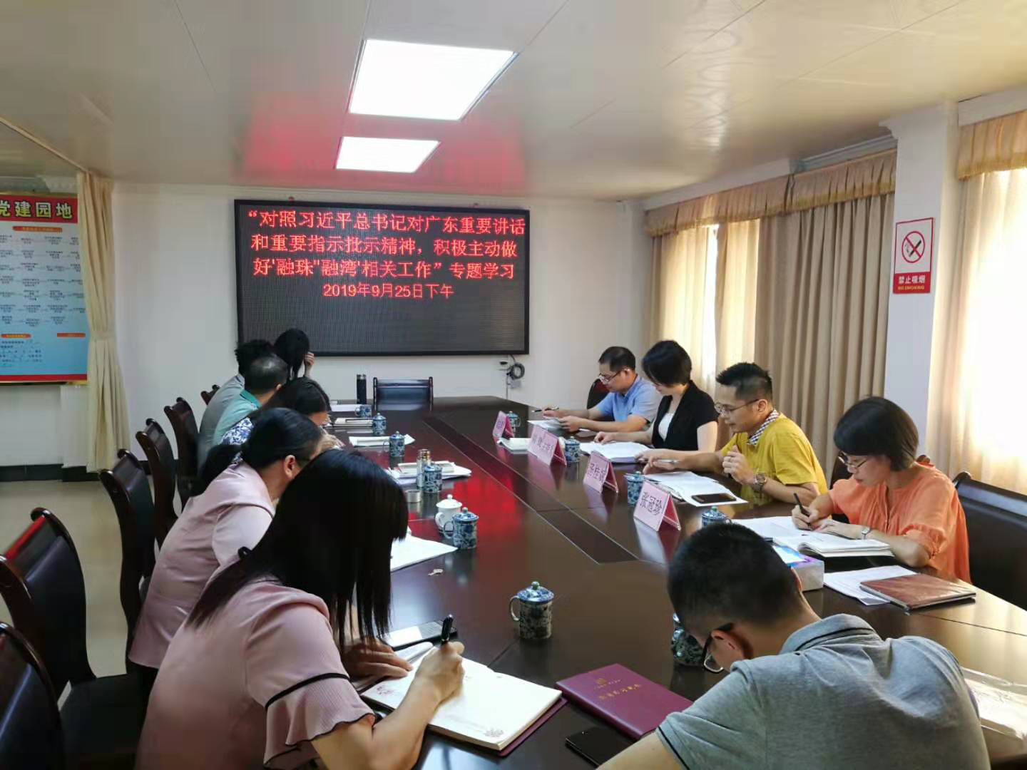 会上,汤桂斌同志作了题为《学习贯彻习近平总书记广东考察重要讲话精神——高举新时代改革开放旗帜,积极主动做好‘融珠’‘融湾’相关工作》的发言,全面学习了习近平总书记在广东考察的重要讲话精神及对广东工作的一系列重要指示精神。