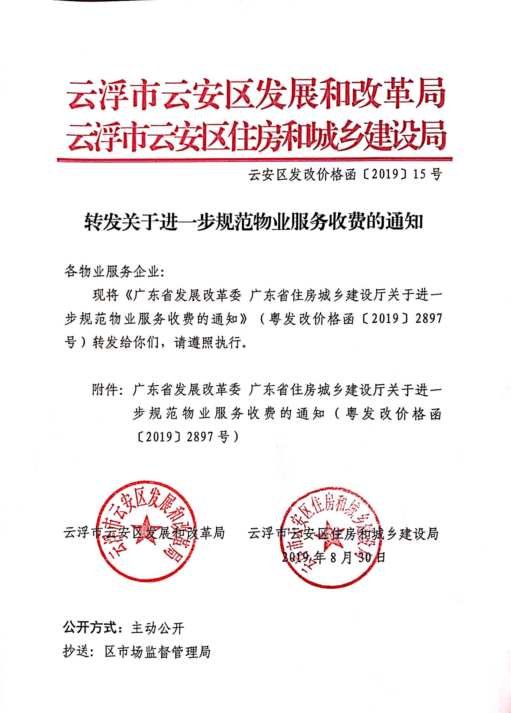 云安区发改价格函〔2019〕15号转发关于进一步规范物业服务收费的通知