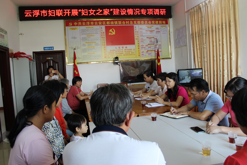 10月11日,云浮市妇联分管领导率领组联部人员一行到我区开展“妇女之家”建设情况专题调研。调研组一行先后深入我区都杨镇联合村(省级第三期“妇女之家”示范点)和金鱼沙村(省级第二期“妇女之家”示范点)了解“妇女之家”建设情况,区妇联负责人及都杨镇妇联等有关人员陪同调研。